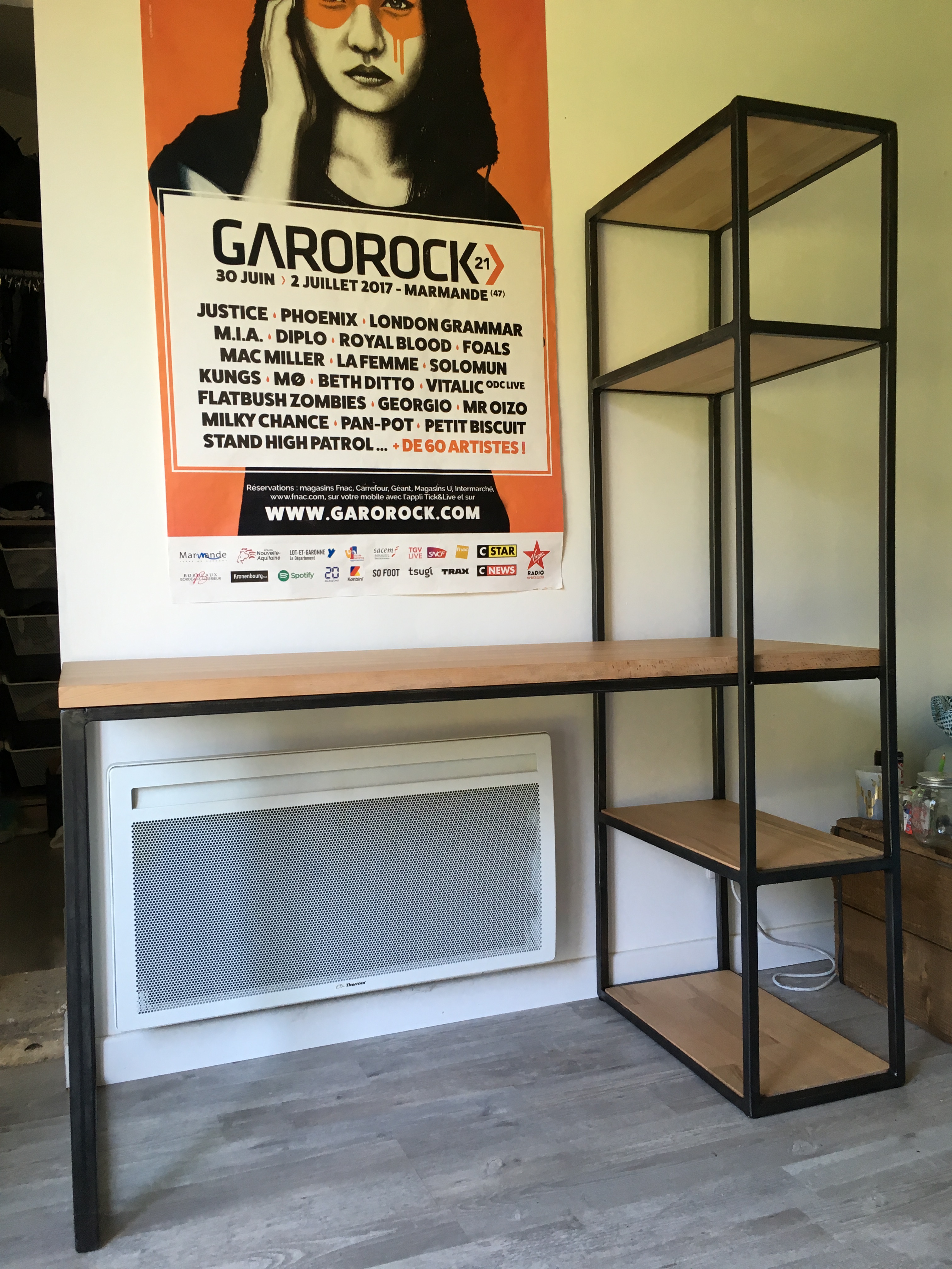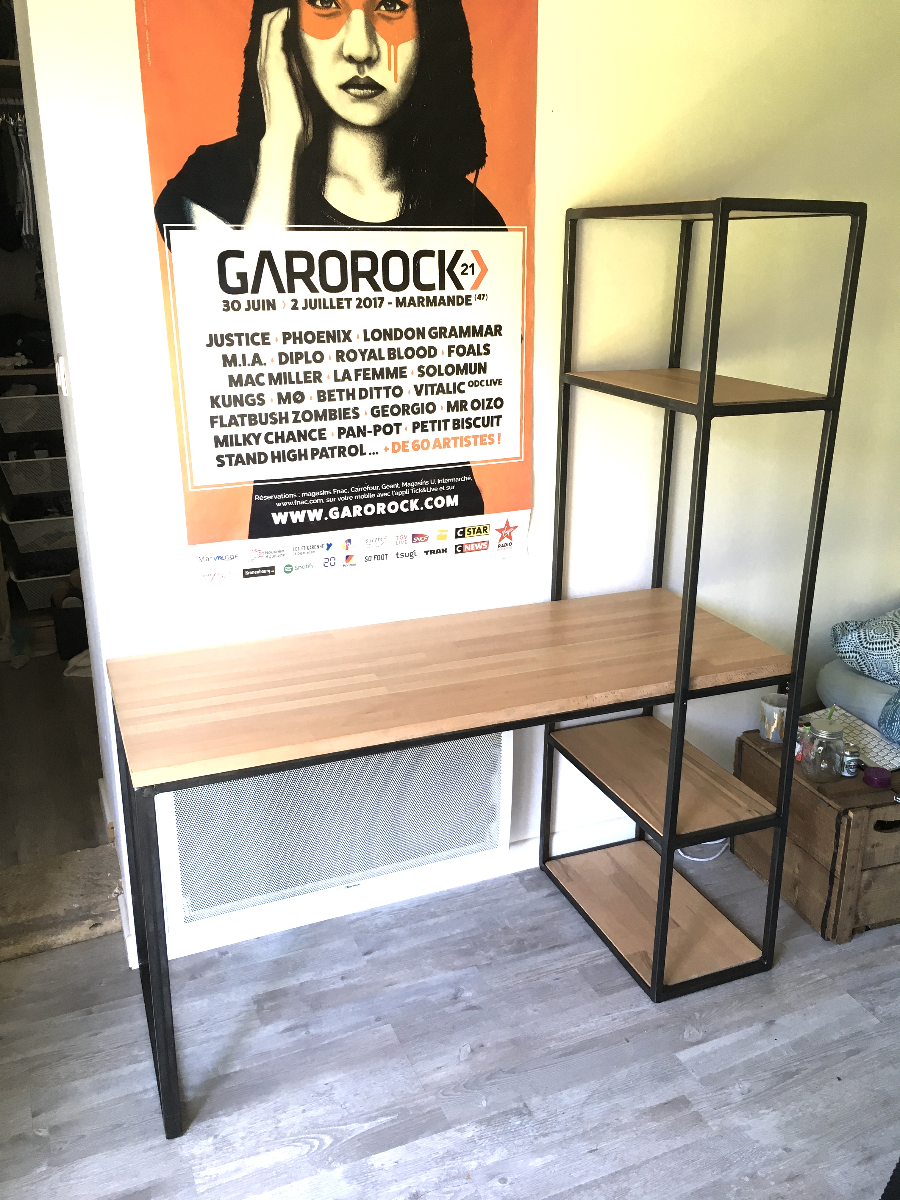 Long: 130,5cm / larg: 49,5 cm / h plateau: 73,5 cm / h étagère: 159 cm / larg étagère: 30 cm.